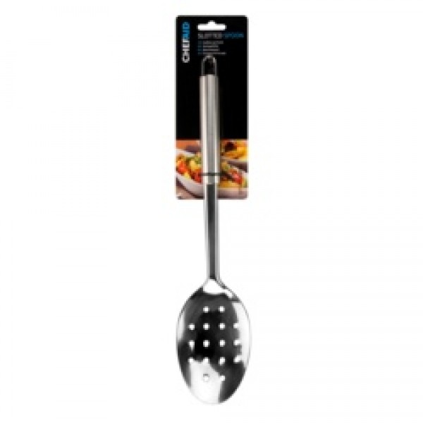 Stainless Steel slotted spoon for draining and skimming.