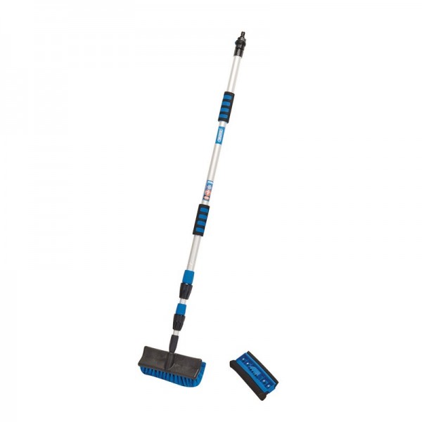 This telescopic washing brush extends from 1.26-3m and is supplied complete with connector and two wash head accessories - a large bristle brush and squeegee. The handle is made from lightweight aluminium and has EVA foam soft grips for comfort when using. It is simple to use, fitted with a quick release 1/2” hose connector and the water flow is easily controlled using the on/off switch. Ideal for most cleaning applications including vehicles, with the extra length particularly useful for cleaning windows, conservatories and greenhouses.