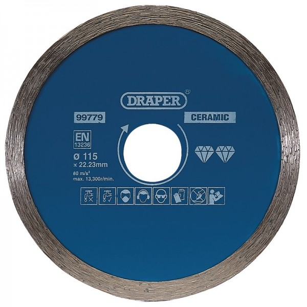 Hardened and tempered diamond blade with continuous rim to provide a smooth cutting finish. Designed for use on ceramic and natural stone tiles. Suitable for dry and wet cutting, with optimum results when used wet. Compatible with most angle grinders and tile cutting machines with a 22.23mm bore.