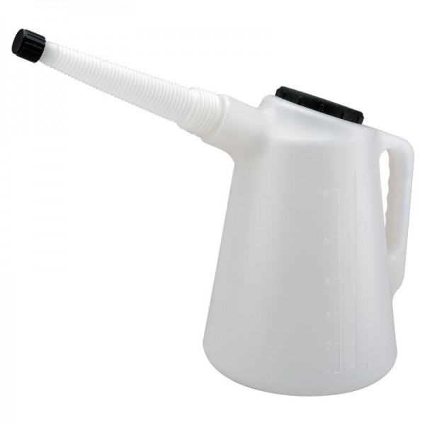 High density polyethylene. Resistant to diesel/petrol, oils and most acids. Flexible spout with carrying handle and screw top lid. Metric and US imperial graduations on jug body. Sold loose.