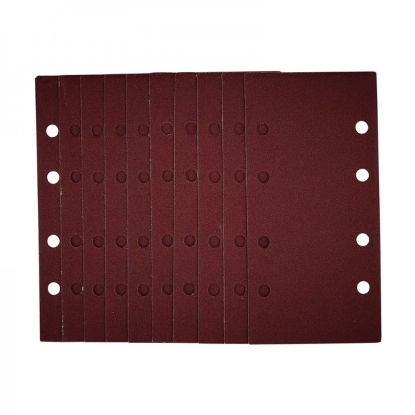 This pack of 1/3 sanding sheets (93 x 190mm) are made from premium quality aluminium oxide that is resin bonded to provide improved grain adhesion, anti-static qualities and long-lasting performance. The heavy-duty E-Weight backing paper makes the sanding sheet more durable - able to withstand the toughest jobs. The hook and loop backing offers decent adhesion to facilitate the fast changing of sanding sheets. The eight pre-punched 8mm holes improve dust extraction. Ideal for sanding and finishing wood, metal, aluminium alloy, painted surfaces, plastic and fillers. Compatible with most 1/3 sanders with hook and loop including Stock No. 57839.