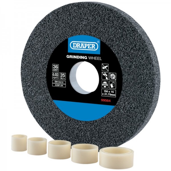 A high-quality, hard-wearing aluminium oxide bench grinding wheel with coarse grit. Suitable for general grinding, deburring and tool sharpening on non-ferrous metals and steel. Dry-cutting use only. Manufactured with a 31.75mm bore and supplied with 5 reduction rings enabling each bench grinding wheel to fit most bench grinders with a bore size between 12.7 – 31.75mm. Compatible with Draper Bench Grinder.