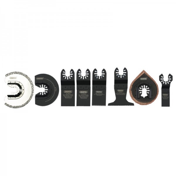 Pack of eight commonly used oscillating multi-tool blades. Designed for cutting ferrous and non-ferrous metal, wood, plastic and plasterboard. With blades included for cutting ceramics, including floor and wall tiles, and removing grout and mortar. Universal fitting for use with Draper and other manufacturers’ oscillating multi-tools.