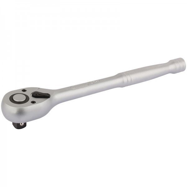 Forged from chrome vanadium steel hardened, tempered and satin finish. 72 tooth ratchet with lever forward/reverse selector and quick release mechanism. Spring - loaded ball bearing for secure socket holding.