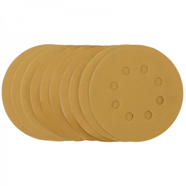 Pack of 10 gold sanding discs made from aluminium oxide with a special treatment of calcium stearate which is resin bonded to provide self-sharpening and anti-clogging performance. The heavy-duty D-Weight backing paper makes the sanding disc more durable - able to withstand the toughest jobs. The hook and loop backing offers decent adhesion to facilitate the fast changing of sanding discs. The eight pre-punched 8mm holes improve the dust extraction during sanding. Ideal for sanding and finishing wood, metals - including ferrous alloys, painted surfaces, varnish, plastic and fillers. Compatible with all 125mm random orbit sanders with a hook and loop backing pad, including Draper Stock No. 58097 and 89522.