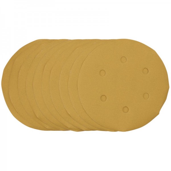 Pack of 10 gold sanding discs made from aluminium oxide with a special treatment of calcium stearate which is resin bonded to provide self-sharpening and anti-clogging performance. The heavy-duty D-Weight backing paper makes the sanding disc more durable - able to withstand the toughest jobs. The hook and loop backing offers decent adhesion to facilitate the fast changing of sanding discs. The six pre-punched 8mm holes improve the dust extraction during sanding. Ideal for sanding and finishing wood, metals - including ferrous alloys, painted surfaces, varnish, plastic and fillers. Compatible with all 150mm random orbit sanders with a hook and loop backing pad, including Draper Stock No. 65084, 83942 and 84125.