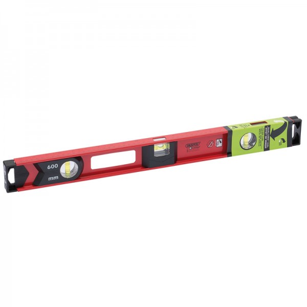 High quality, hardened aluminium girder section levels with three permanently fixed solid acrylic cylindrical shock resistant UV resistant vials, one horizontal, one vertical with side view feature and one 45° vial. Levels electrostatically, epoxy powder coated and baked for maximum protection. Metric/imperial rule on top edge. Fitted with shock absorbing end caps. V-Groove for levelling pipework. Accuracy 1.75mm per 1M = 0.1° in standard position.